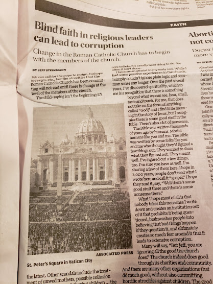 We can call for the pope to resign, bishops to resign, etc., but the atrocities that the Roman Catholic Church has been committing will not end until there is change at the level of the members of the church.